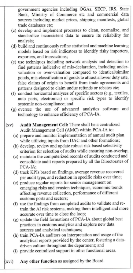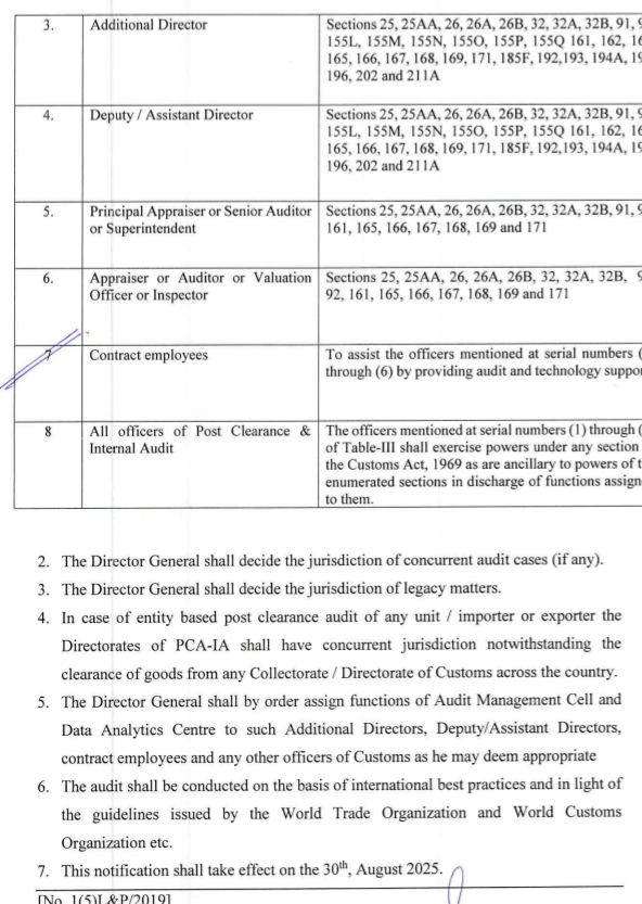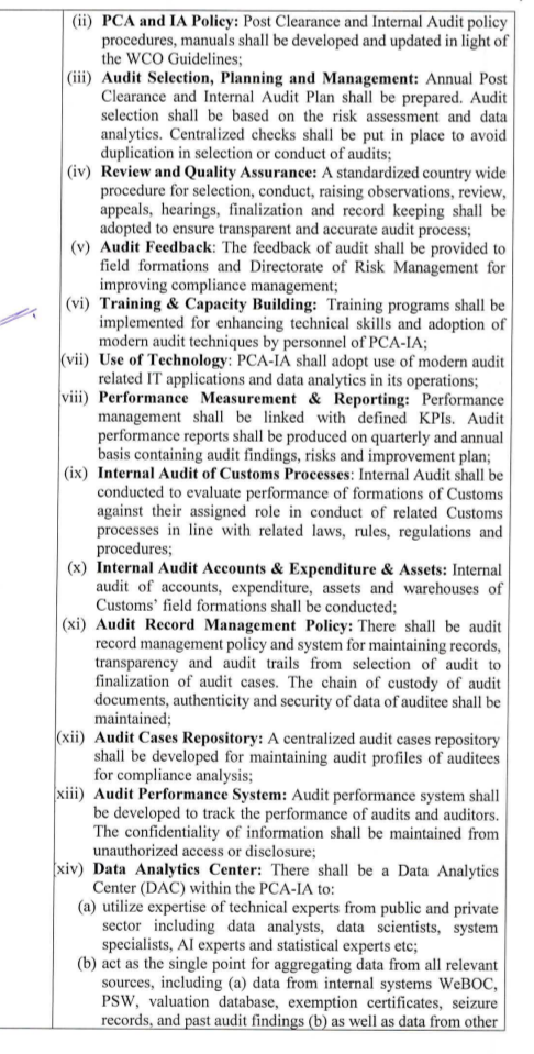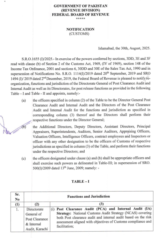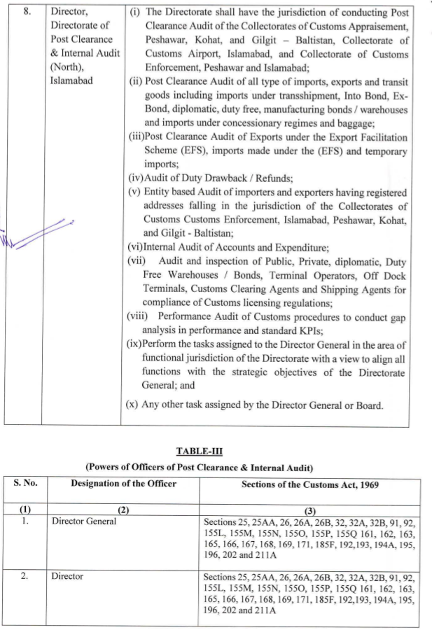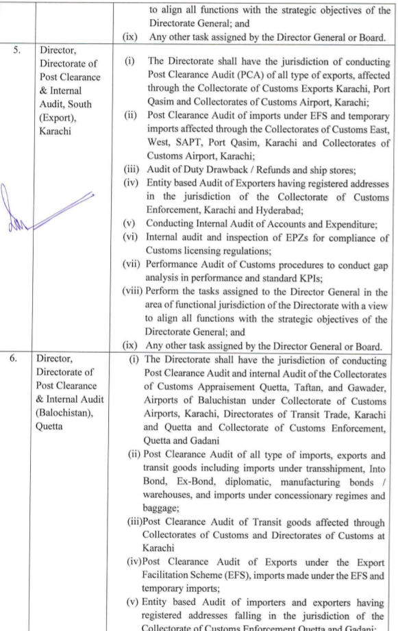 قانونی پہلو اور اہم نکات پر ماہرین کا کہنا ہے کہ قانونی دائرہ کار کا تعین نئے ایس آر او کے ذریعے ایف بی آر نے سابقہ ایس آر او 1114 اور ایس آر او 1494 کو منسوخ کرکے ڈائریکٹوریٹ جنرل پوسٹ کلیرنس و انٹرنل آڈٹ کا دائرہ کار ازسرنو متعین کیا ہے۔