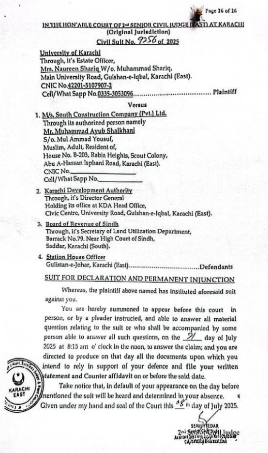 جامعہ کراچی کے اطراف قبضہ مافیا کئی برسوں سے سرگرم ہے اور چھوٹے پلاٹس پر قبضے بھی ہوچکے ہیں۔ تاہم اب اربوں روپے کی قیمتی اراضی پر قبضے کی سب سے بڑی اور منظم کوشش شروع کی جارہی ہے۔ ذرائع کا کہنا ہے کہ سندھ کا طاقتور سسٹم مکمل طور پر متحرک ہوچکا ہے اور اگر بروقت عدالتی و قانونی کارروائی نہ ہوئی تو جامعہ کراچی کا مستقبل تاریک ہوسکتا ہے۔