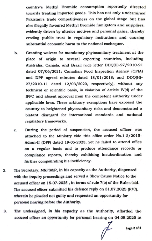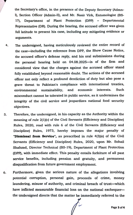 سہیل شہزاد کو شوکاز نوٹس اور ذاتی سماعت کا موقع دیا گیا تاہم سیکرٹری فوڈ سکیورٹی نے ریکارڈ، تحریری جواب اور زبانی مؤقف سننے کے بعد قرار دیا کہ الزامات مکمل طور پر ثابت ہو چکے ہیں اور ان کے اقدامات نے قومی مفادات، بین الاقوامی ذمہ داریوں اور عوامی اعتماد کو شدید نقصان پہنچایا ہے۔