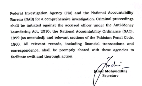 دوسری جانب وزارت نے معاملہ فوری طور پر وفاقی تحقیقاتی ایجنسی (FIA) اور قومی احتساب بیورو (NAB) کو بھیجنے کا حکم دیا ہے۔ دونوں ادارے افسر کے خلاف کرپشن، ذاتی فوائد، منی لانڈرنگ اور قومی خزانے کو نقصان پہنچانے کے الزامات پر فوجداری تحقیقات کریں گے۔ یہ کارروائی اینٹی منی لانڈرنگ ایکٹ 2010، نیشنل اکاؤنٹیبلٹی آرڈیننس 1999 اور پاکستان پینل کوڈ 1860 کے تحت کی جائے گی۔