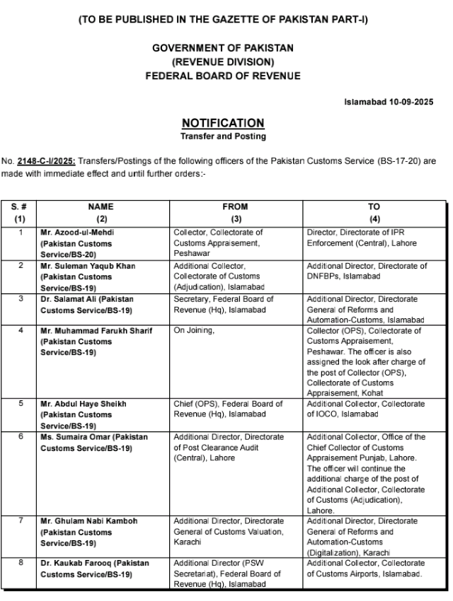پاکستان کسٹمز کے اندر طاقت کے کھیل نے ایک بار پھر سوالات کھڑے کر دیے ہیں۔ فیڈرل بورڈ آف ریونیو (ایف بی آر) نے گریڈ 20 سے گریڈ 17 تک کے 70 افسران کے تبادلوں کا نوٹیفکیشن جاری کیا ہے، مگر ان تقرریوں میں سب سے حیران کن اور متنازعہ فیصلہ ایف آئی اے کے مقدمے اور منی لانڈرنگ انکوائری میں نامزد افسر امجد حسین راجپر کی تعیناتی ہے۔ انہیں اسمگلنگ کے سب سے اہم پوائنٹ حیدرآباد میں ایڈیشنل کلکٹر کے عہدے پر بھیجا گیا ہے۔