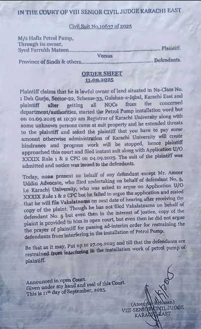 واضح رہے کہ یکم ستمبر 2025 کو جامعہ کراچی کی انتظامیہ نے مذکورہ مقام پر موجود افراد کو تنبیہ کی تھی کہ وہ یہ جگہ خالی کردیں کیونکہ یہ اراضی جامعہ کراچی کی ملکیت ہے تاہم افراد نے زمین کی ملکیت کا دعویٰ کیا اور جامعہ کراچی کے اسٹیٹ آفس کا حوالہ دے دیا۔ اس کے بعد دعویدار سید فاروق متین نے میسرز "حافظ پیٹرول” کے نام سے سینیر سول جج ایسٹ عتیق الرحمن کے پاس درخواست دائر کی اور عدالت کو بتایا کہ نا کلاس نمبر ایک دہییہ گرجو سیکٹر 22 اسکیم 33 گلشن اقبال کے وہ قانونی مالک ہیں اور جامعہ کراچی انہیں بے دخل کرنا چاہتی ہے اور پیٹرول پمپ کی تعمیر نہیں کرنے دی جارہی۔