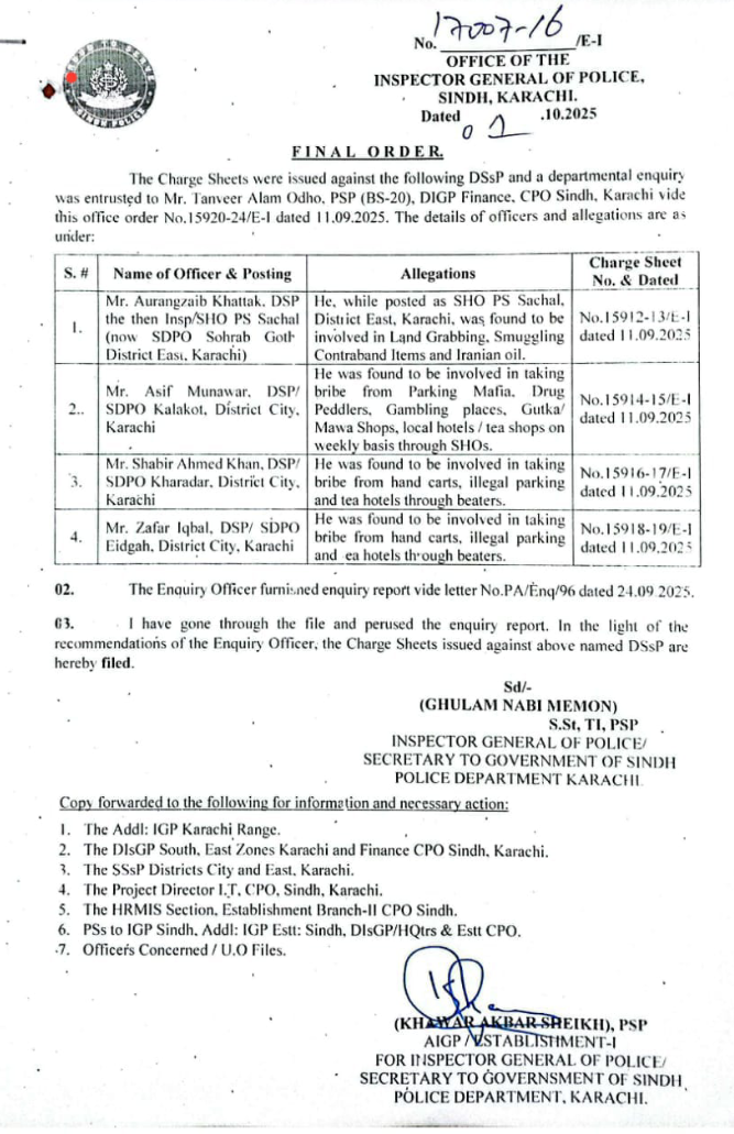 آئی جی سندھ غلام نبی میمن کے دستخط سے جاری آرڈر کے مطابق ڈی ایس پی اورنگزیب خٹک (سابق ایس ایچ او سچل، موجودہ ایس ڈی پی او سہراب گوٹھ) پر زمینوں پر قبضہ، ایرانی آئل اور اسمگلنگ کے الزامات ثابت ہوئے۔ڈی ایس پی آصف منور (ایس ڈی پی او کلاکوٹ) پر پارکنگ مافیا، منشیات فروشوں اور قمار بازی کے اڈوں سے ہفتہ وار بھتہ لینے کے شواہد سامنے آئے۔ڈی ایس پی شبیر احمد خان (ایس ڈی پی او کھارادر) اور ڈی ایس پی ظفر اقبال (ایس ڈی پی او عیدگاہ) پر ٹھیلے والوں، غیر قانونی پارکنگ اور ہوٹلوں سے رشوت لینے کے ثبوت ملے۔انکوائری رپورٹ آنے کے باوجود تمام چارج شیٹس فائل کر دی گئیں اور کوئی کارروائی نہ ہوئی۔