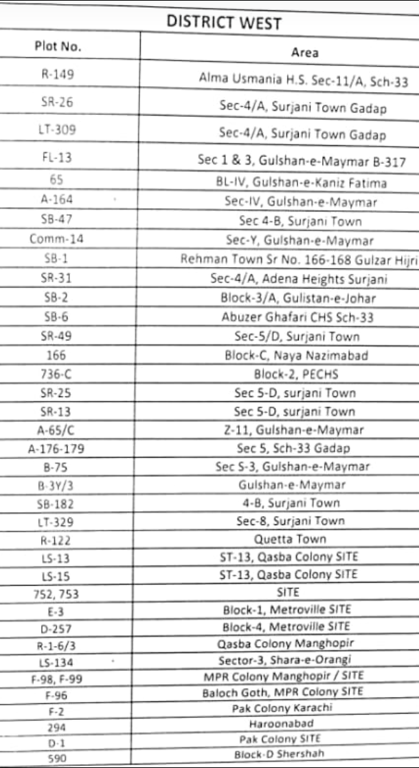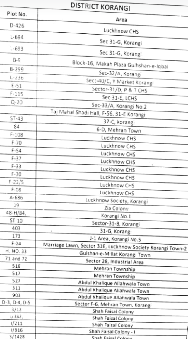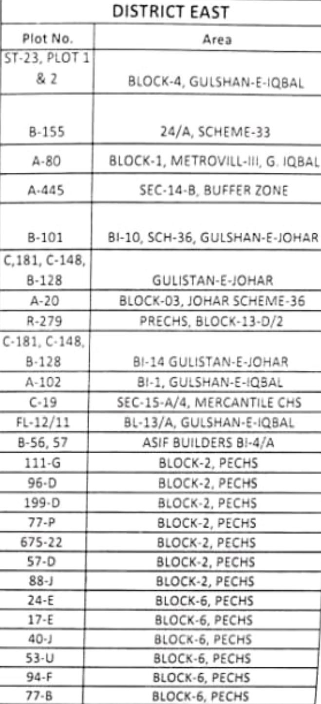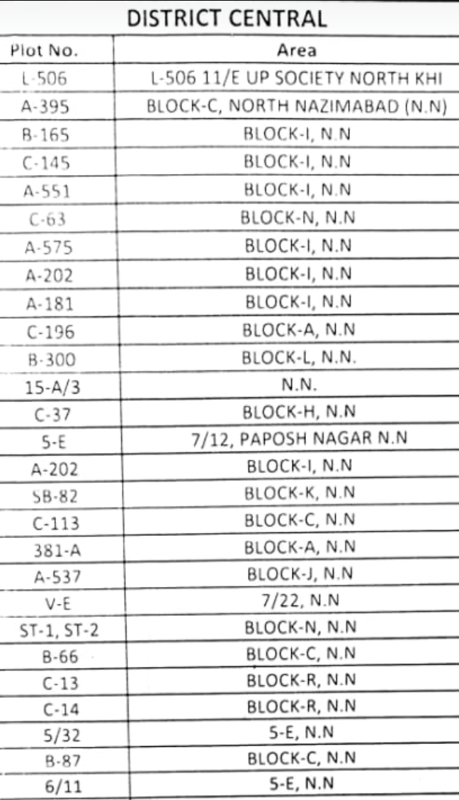 ذرائع کے مطابق نیب کو فراہم کی گئی ابتدائی فہرست میں ضلع شرقی میں 70 سے زائد غیر قانونی تعمیرات، ضلع جنوبی میں 63، کورنگی میں 41، ملیر میں 29، ضلع غربی میں 37 جبکہ سب سے زیادہ یعنی 117 سے زائد غیر قانونی تعمیرات ضلع وسطی میں ریکارڈ کی گئیں جن میں نارتھ ناظم آباد، ناظم آباد اور فیڈرل بی ایریا سرِفہرست ہیں۔