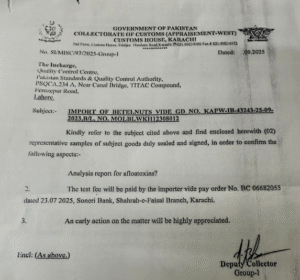ذرائع کا کہنا ہے کہ اس پورے معاملے میں بدعنوانی، اثرورسوخ اور ادارہ جاتی کمزوریوں کی بدترین مثال سامنے آئی ہے، لہٰذا وفاقی حکومت، ایف بی آر اور اینٹی کرپشن اداروں کو فوری طور پر اس سازش کی عدالتی سطح پر تحقیقات شروع کرنی چاہیے تاکہ یہ خطرناک سامان انسانی خوراک کی مارکیٹ میں داخل ہونے سے پہلے تلف کیا جا سکے۔