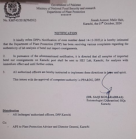 کسٹمز اور ڈپارٹمنٹ آف پلانٹ پروٹیکشن کے افسران کی ملی بھگت سے کراچی کی معروف چھالیہ کمپنیوں کے لیے انتہائی مضر صحت چھالیہ کو اکشن کے ذریعے کلیئر کروانے کی خطرناک کوششیں شروع کر دی گئی ہیں۔