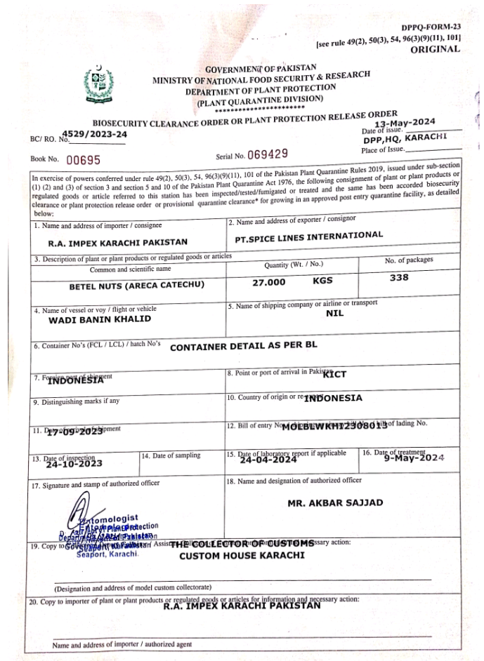 نومبر 2023 میں میسرز آر اے امپکس کے نام پر انڈونیشیا سے درآمد کی گئی چھالیہ کی کنسائنمنٹ کو افلاٹوکسن رپورٹ میں 68 بی پی پی پایا گیا، لیکن کلئیرنس ایجنٹس اور پلانٹ پروٹیکشن کے افسران کی ملی بھگت سے رپورٹ میں خلاف ضابطہ تبدیلی کرتے ہوئے اسے 18 بی پی پی ظاہر کیا گیا، جس پر کسٹمز انٹیلی جنس نے بروقت کارروائی کرتے ہوئے کنٹینرز کو بلاک کر دیا۔