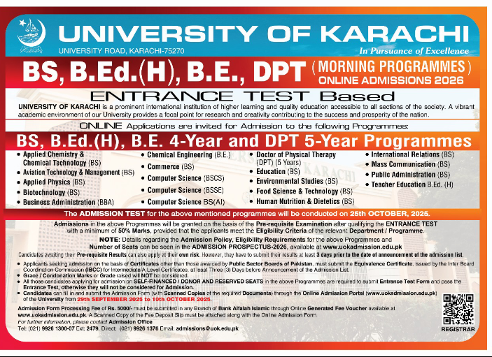 سال 2026 کے داخلوں کے لیے جامعہ کراچی نے 19 مختلف شعبہ جات میں بی ایس، بی ایڈ آنرز، بی ای، چار سالہ اور پانچ سالہ ڈپلومہ پروگرامز کے فارم کا اجراء کیا، مگر طلبہ کی کم دلچسپی کے باعث 10 اکتوبر 2025 کی آخری تاریخ میں اضافہ کر کے 15 اکتوبر کرنی پڑی۔ اس کے باوجود فارم جمع کرانے والوں کی تعداد گزشتہ چار برس کے مقابلے میں 30 فیصد سے بھی کم ہے۔زرائع کے مطابق رواں سال ٹیسٹ بنیاد پر داخلے والے شعبہ جات میں تقریباً 2800 طلبہ نے فارم جمع کروائے اور انتظامیہ کو پہلی مرتبہ فارم کی تاریخ میں تیسری بار توسیع کا فیصلہ کرنا پڑا، جو انتظامی نااہلی اور پالیسی کی ناکامی کا منہ بولتا ثبوت ہے۔