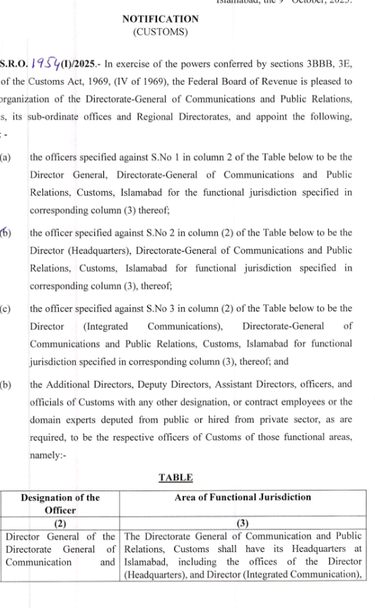 وفاقی حکومت نے ریونیو ڈویژن کے تحت فیڈرل بورڈ آف ریونیو (ایف بی آر) کی جانب سے ایک نوٹیفکیشن جاری کرتے ہوئے پاکستان کسٹمز میں ڈائریکٹوریٹ جنرل آف کمیونیکیشن اینڈ پبلک ریلیشنز کے قیام کا باقاعدہ اعلان کر دیا ہے۔ یہ ادارہ ملک بھر میں کسٹمز کی میڈیا، ابلاغ، عوامی آگاہی اور تشہیری پالیسیوں کو جدید خطوط پر استوار کرنے کا ذمہ دار ہوگا۔