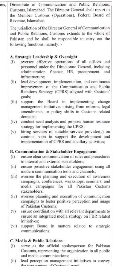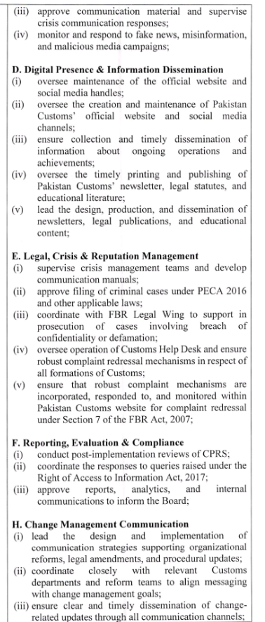 نوٹیفکیشن میں تین کلیدی عہدوں پر تقرریاں عمل میں لائی گئی ہیں جس میں ڈائریکٹر جنرل، ڈائریکٹوریٹ جنرل آف کمیونیکیشن اینڈ پبلک ریلیشنز، کسٹمز اسلام آباد،پاکستان کسٹمز کی کمیونیکیشن اور پبلک ریلیشنز کی مرکزی قیادت کریں گے۔ادارے کی اسٹریٹجک پالیسی، میڈیا حکمت عملی، عوامی آگاہی مہمات اور ڈیجیٹل موجودگی کے نگران ہوں گے۔ایف بی آر اور کسٹمز کی شبیہ بہتر بنانے، اور میڈیا میں منفی خبروں کا بروقت جواب دینے کے ذمہ دار ہوں گے۔