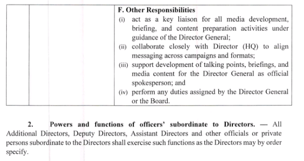 نوٹیفکیشن کے مطابق نیا ڈائریکٹوریٹ درج ذیل امور انجام دے گا ان امور میں کمیونیکیشن اینڈ پبلک ریلیشنز اسٹریٹیجی (CPRS) کی تیاری اور نفاذ،اصلاحات، قانونی ترامیم اور پالیسی تبدیلیوں سے متعلق معلومات کا مؤثر ابلاغ۔پبلک ریلیشنز اور میڈیا سے متعلق ماہرین یا نجی اداروں کی خدمات حاصل کرنا ہے۔