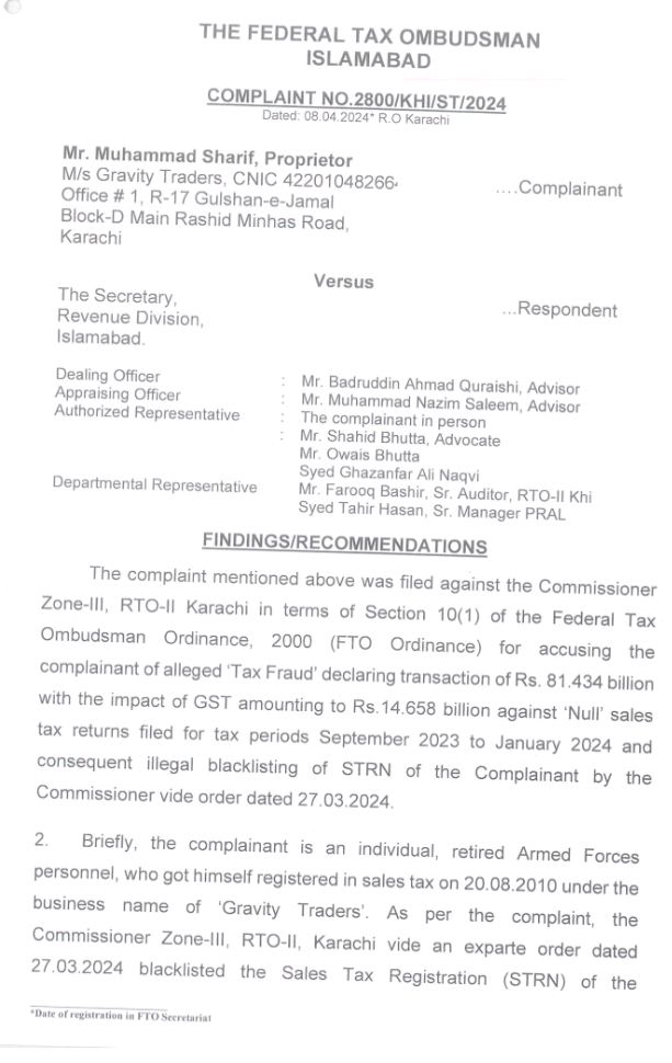رپورٹ کے مطابق ریجنل ٹیکس آفس ون کراچی میں ایف آئی آر نمبر 1/2024 کی تحقیقات کے دوران 524 ارب روپے کا سیلز ٹیکس فراڈ بے نقاب ہوا۔ تفتیشی افسر نے شواہد کے ساتھ انکشاف کیا کہ یہ فراڈ پرال اور ایف بی آر کے اندر موجود ایک منظم سائبر نیٹ ورک نے کیا، جو ایک کھرب 62 ارب روپے کی بوگس انوائسسز کو سسٹم میں محض ایک لفظ کی تبدیلی، مختلف آئی پی ایڈریسز، موبائل نمبرز، ای میلز اور PIN/Password کی مبینہ چوری کے ذریعے اپ لوڈ کرتا رہا۔صرف یہی نہیں ، وفاقی ٹیکس محتسب نے بھی ایک سال پہلے کارروائی کا حکم دیا تھا مگر نتیجہ صفر نکلا۔ گویا کارروائی کا ہر دروازہ بند اور ہر راستہ کسی نہ کسی طاقتور ہاتھ نے روک رکھا ہے۔