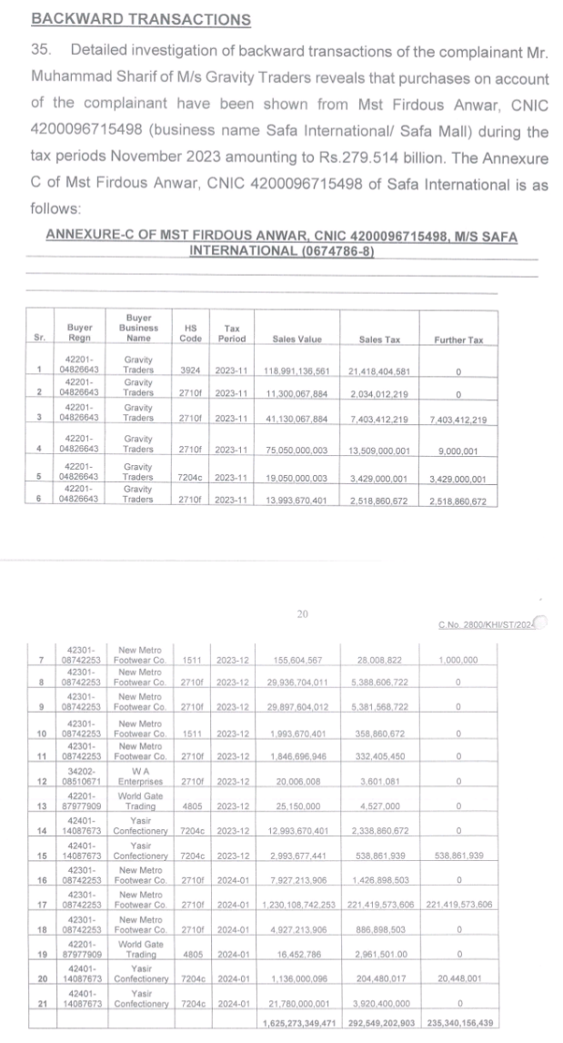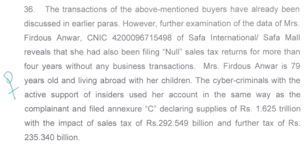 تحقیقات میں انکشاف ہوا کہ صفا انٹرنیشنل نامی کمپنی ایک 80 سالہ خاتون کے نام پر رجسٹرڈ کی گئی،اسی سے 1.62 ٹریلین (کھرب 62 ارب) کی بوگس سپلائیز ظاہر کی گئیں،292 ارب سیلز ٹیکس + 232 ارب دیگر ٹیکس ظاہر کیے گئے اور مجموعی طور پر یہ فراڈ 524 ارب کا ہوگیا۔