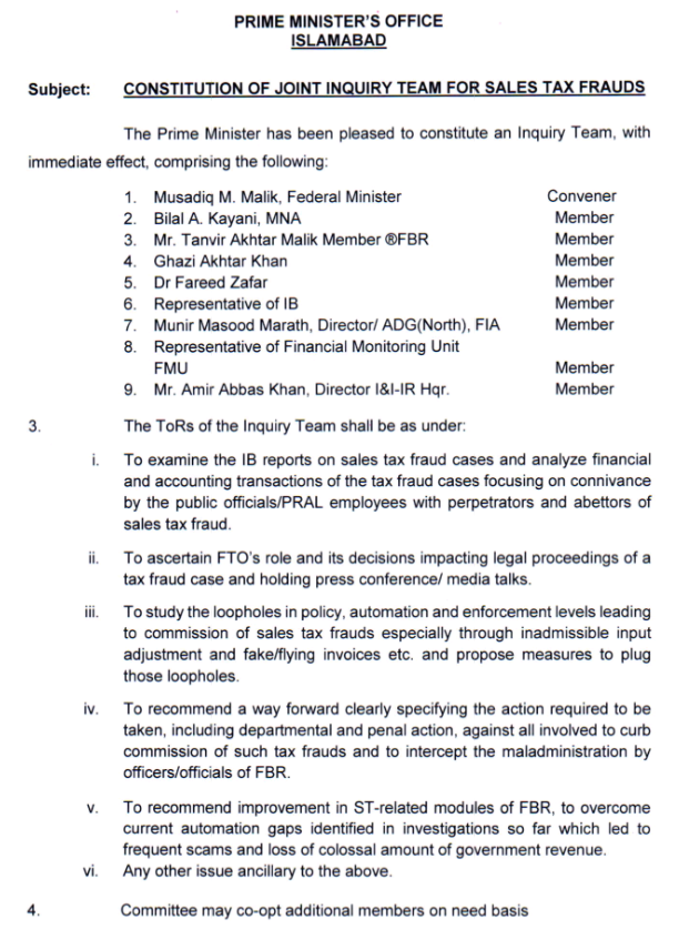 دسمبر 2024 میں وزیر اعظم کی ہدایت پر جے آئی ٹی بنائی گئی، جس کے کنوینر وفاقی وزیر مصدق ملک تھے اور TORs میں صاف درج تھا کہ بوگس انوائسسز،پرال کے کردار،سیلز ٹیکس فراڈ،سسٹم کی خامیاں اور ملوث افسران،سب کی 30 دن میں تحقیقی رپورٹ دی جائے۔تاہم آج تک JIT رپورٹ منظرِ عام پر نہیں آئی۔