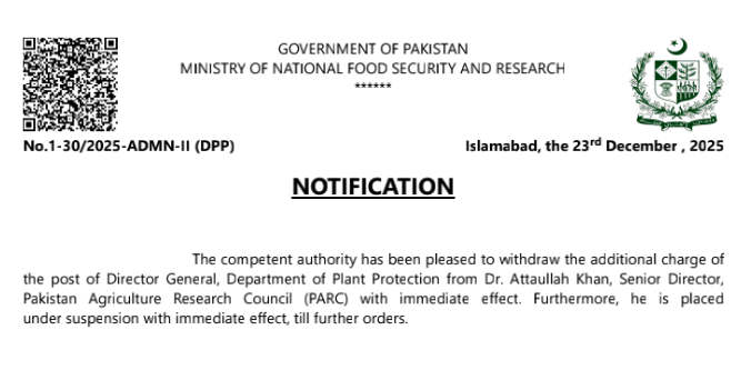 چھالیہ اسمگلنگ نیٹ ورک کی طاقت اتنی گہری نکلی کہ ڈپارٹمنٹ آف پلانٹ پروٹیکشن (ڈی پی پی) نے وزیراعظم پاکستان کے واضح احکامات بھی پسِ پشت ڈال دیے۔ وفاقی حکومت نے سنگین بے ضابطگیوں، مبینہ ملی بھگت، جعلسازی اور قواعد کے من مانے تبدیل شدہ اطلاق کے الزامات پر ڈائریکٹر جنرل ڈی پی پی ڈاکٹر عطاء اللہ خان، ڈپٹی ڈائریکٹر ڈاکٹر عبدالباسط، ڈپٹی ڈائریکٹر اینٹامولوجسٹ مزمل حسین سمیت اہم افسران کو فوری برطرف کر دیا ہے۔ معاملے کی اعلیٰ سطح پر چھان بین کے لیے نیشنل فوڈ سیکیورٹی اینڈ ریسرچ کے ایڈیشنل سیکرٹری عالم زیب خان اور اسٹیبلشمنٹ ڈویژن کے گریڈ 21 افسر کو فیکٹ فائنڈنگ کی ذمے داری سونپی گئی ہے، جو براہِ راست وزیر اعظم کو رپورٹ پیش کریں گے۔ ساتھ ہی نیب اور ایف آئی اے کو بھی تحقیقات کا حکم جاری کر دیا گیا ہے۔