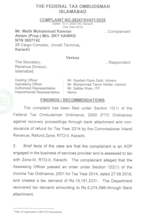 یہ فیصلہ میسرز اسکائی ہاک کی جانب سے ٹیکس سال 2014 کے معاملے پر دائر شکایت پر سنایا گیا، جس میں ان لینڈ ریونیو کی جانب سے اختیارات کے ناجائز استعمال، عدالتی احکامات کی سنگین خلاف ورزی اور ٹیکس دہندہ کو مالی و ذہنی اذیت میں مبتلا کرنے کے الزامات درست ثابت ہو گئے۔