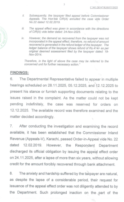 ایف ٹی او کے فیصلے میں انکشاف کیا گیا ہے کہ محکمہ ان لینڈ ریونیو نے نہ صرف اپیلیٹ احکامات کو دانستہ طور پر نظرانداز کیا بلکہ چھ سال سے زائد عرصہ تک اپیل ایفیکٹ جاری ہی نہیں کیا۔ بالآخر 24 نومبر 2025 کو اپیل ایفیکٹ جاری کیا گیا تاہم اس میں بھی بینک اٹیچمنٹ کے ذریعے وصول شدہ رقم کا کریڈٹ شامل نہیں کیا گیا، جس کے باعث ٹیکس دہندہ اپنے جائز اور قانونی ریفنڈ سے محروم رہا۔