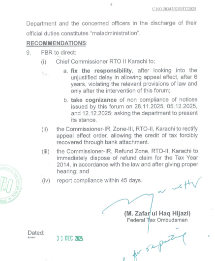 فیڈرل ٹیکس محتسب (FTO) نے فیڈرل بورڈ آف ریونیو (FBR) اور بالخصوص کمشنر ان لینڈ ریونیو، ریفنڈ زون، آر ٹی او-II کراچی اور متعلقہ افسران کے خلاف ایک سخت، غیرمعمولی اور فیصلہ کن حکم جاری کرتے ہوئے انہیں بدانتظامی کا مرتکب قرار دے دیا ہے۔