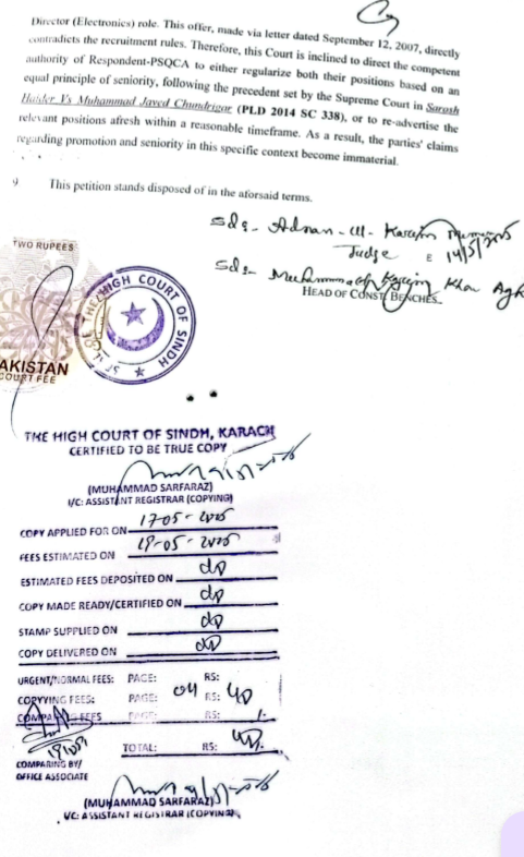 پی ایس کیو سی اے میں نااہل افسران کے خلاف گزشتہ برس 14 مئی کو سندھ ہائی کورٹ نے فیصلہ جاری کیا، جس میں کرپٹ اور نااہل افسران کو عہدوں سے ہٹانے کا حکم دیا گیا، تاہم آٹھ ماہ سے زائد عرصہ گزرنے کے باوجود اس عدالتی حکم نامے پر عمل درآمد نہیں ہو سکا۔