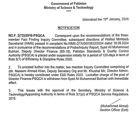 واضح رہے کہ گزشتہ روز وفاقی وزارت سائنس اینڈ ٹیکنالوجی سے ایک نوٹیفکیشن جاری ہوا جس میں ڈپٹی ڈائریکٹر فنانس گریڈ 18 کے افسر سید علی محمد بخاری کو معطل کرنے کے احکامات کے ساتھ مزید کارروائی کے لیے دو رکنی کمیٹی تشکیل دی گئی۔ اس کمیٹی میں نسیم احمد خان ڈپٹی سیکرٹری آرگنائزیشن اور خوشحال میر ڈائریکٹر ایڈمن پی ایس کیو سی اے کو شامل کیا گیا۔نوٹیفکیشن میں دعویٰ کیا گیا کہ یہ فیصلہ وفاقی محتسب سیکرٹریٹ کی جانب سے 18 ستمبر 2024 کی شکایت نمبر WMS QTA/0003832/2024 میں موصول ہونے والی ہدایات کی روشنی میں اٹھایا گیا ہے۔