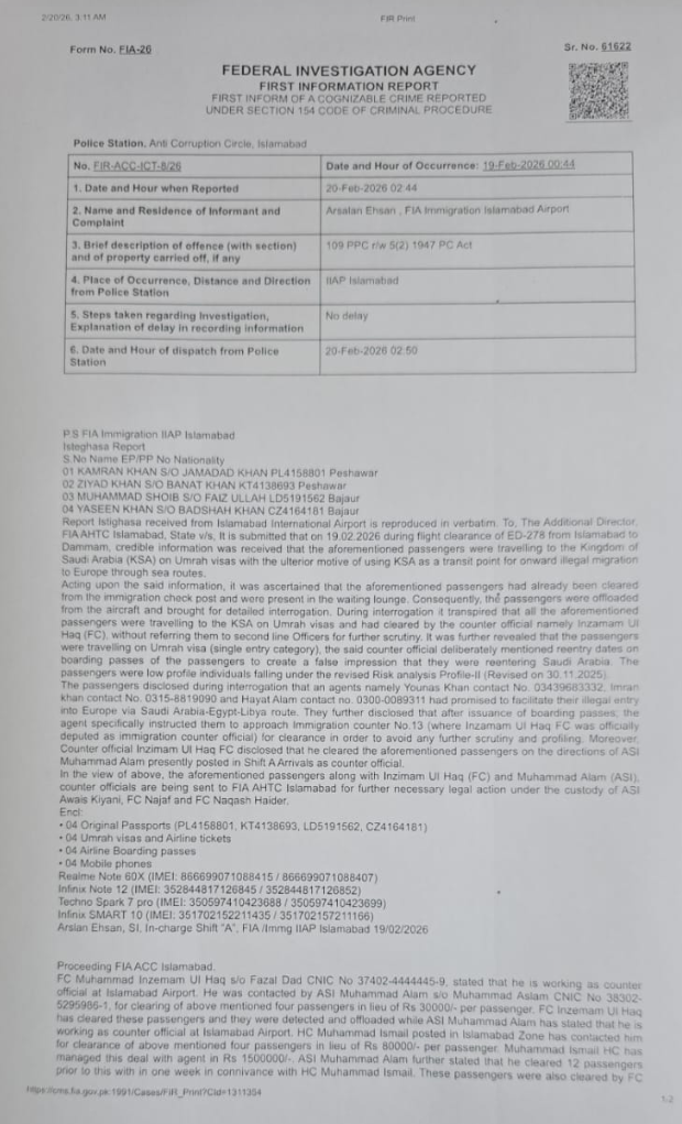 تفتیش کے دوران انکشاف ہوا کہ امیگریشن کاؤنٹر پر تعینات انضمام الحق (FC) نے بغیر مزید جانچ کے مسافروں کو کلیئر کیا۔ مزید یہ کہ بورڈنگ پاسز پر انٹری کی تاریخیں جان بوجھ کر درج کی گئیں تاکہ یہ تاثر دیا جا سکے کہ مسافر پہلے بھی سعودی عرب جا چکے ہیں۔