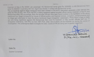 ایف آئی اے نے ملزمان انضمام الحق (ایف سی اہلکار) اور اے ایس آئی محمد عالم کے خلاف مقدمہ درج کرلیا ہے۔اور اس مقدمے میں تعزیرات پاکستان کی دفعہ 109پریوینشن آف کرپشن ایکٹ 1947 کی دفعہ 5(2)امیگریشن آرڈیننس کی متعلقہ دفعات شامل کی گئی ہیں دیگر ملوث افراد کے کردار کی بھی تفتیش جاری ہے۔