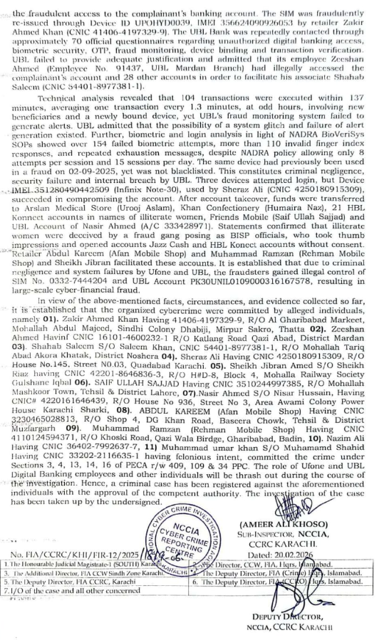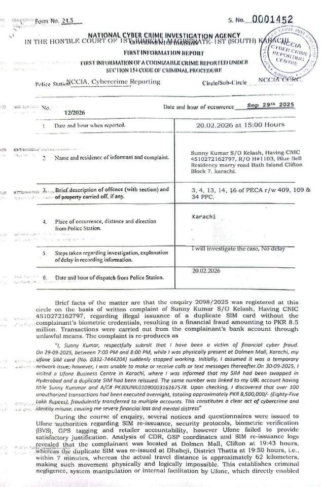 نیشنل سائبر کرائم انوسٹی گیشن ایجنسی کراچی نے بینکنگ سائبر فراڈ اور سم سوئپنگ اسکینڈل کا سراغ لگاتے ہوئے منظم گروہ کے خلاف مقدمہ درج کرلیا۔ مقدمہ الزام نمبر 12/2026 کے مطابق درخواست گزار سنی کمار ولد کیلاش جو باتھ آئی لینڈ کلفٹن کراچی کا رہائشی ہے نے شکایت درج کروائی کہ 29 ستمبر 2025 کو وہ ڈولمن مال کراچی میں موجود تھے کہ ان کا یوفون سم نمبر اچانک بند ہوگیا۔ اگلے روز یوفون بزنس سینٹر جانے پر انکشاف ہوا کہ ان کی سم بغیر بائیومیٹرک تصدیق کے حیدرآباد/دھابیجی میں دوبارہ جاری کردی گئی ہے۔