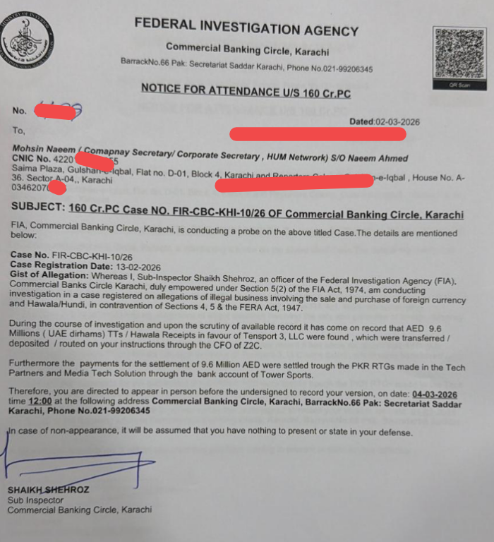 ایف آئی اے کمرشل بینکنگ سرکل کراچی نے Hum News کے کمپنی سیکرٹری محسن نعیم کو نوٹس کے زریعے بدھ کو طلب کرلیا ہے جس میں ان سے ریکارڈ طلب کیا گیا ہے۔ واضح رہے کہ اس سے قبل اسی کیس میں ایف آئی اے کمرشل بینکنگ سرکل نے Z2C کے سی ای او ریحان علی مرچنٹ کو دو نوٹسسز جاری کیے تھے جس کے جواب میں انہوں نے اپنی لیگل ٹیم کے زریعے جواب بھیجا ہے، اور اس ریکارڈ کی ایف آئی اے میں چھان بین جاری ہے جبکہ امکان ہے کہ اس ریکارڈ کی روشنی میں مزید میڈیا مالکان اس کیس کی زد میں آسکتے ہیں۔