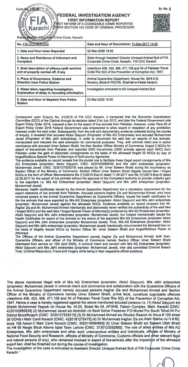 دوسری جانب ایف آئی اے کارپوریٹ کرائم سرکل کراچی نے انکوائری نمبر 21/2019 کو باضابطہ طور پر مقدمہ الزام نمبر 05/2026 میں تبدیل کر کے درج کر لیا ہے۔ اس مقدمے میں وزارت تجارت کے 2018 میں تعینات سیکشن افسر عمر سلیم بھٹی اور منسٹری آف فوڈز سائنس اینڈ ریسرچ کے ماتحت آنے والے اینیمل کورنٹائن ڈپارٹمنٹ کے افسر اصغر ضیاء کو گرفتار کر لیا گیا ہے۔