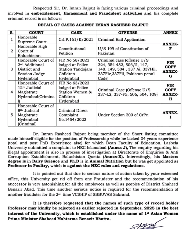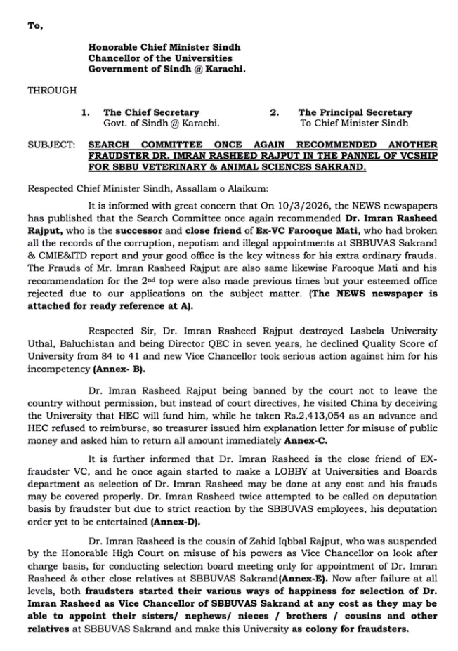 درخواست میں کہا گیا ہے کہ پیش کردہ شواہد اور مصدقہ حقائق کی روشنی میں، شہید بینظیر بھٹو یونیورسٹی آف ویٹرنری اینڈ اینیمل سائنسز سکرنڈ کے طلبہ اور دیگر اسٹیک ہولڈرز یہ مطالبہ کرتے ہیں کہ ڈاکٹر عمران رشید راجپوت کو وائس چانسلر کے عہدے کے لیے جاری سلیکشن پراسیس، بشمول انٹرویو، میں شرکت کے لیے نااہل قرار دیا جائے۔