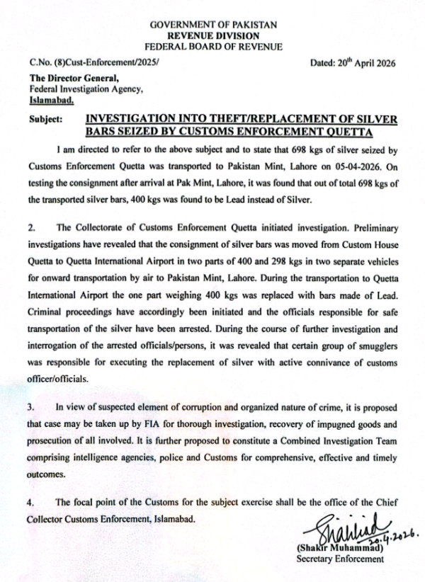 فیڈرل بورڈ آف ریونیو (ایف بی آر) نے کسٹم کلکٹریٹ انفورسمنٹ کوئٹہ میں سرکاری طور پر تحویل میں لی گئی 400 کلو چاندی کی حیران کن چوری اور ردوبدل کے اسکینڈل پر بڑا قدم اٹھاتے ہوئے تحقیقات فیڈرل انویسٹی گیشن ایجنسی (ایف آئی اے) کے سپرد کر دی ہیں۔ اس پیش رفت نے نہ صرف کسٹمز نظام پر سنگین سوالات اٹھا دیے ہیں بلکہ ادارہ جاتی بدعنوانی کی گہری جڑوں کو بھی بے نقاب کر دیا ہے۔