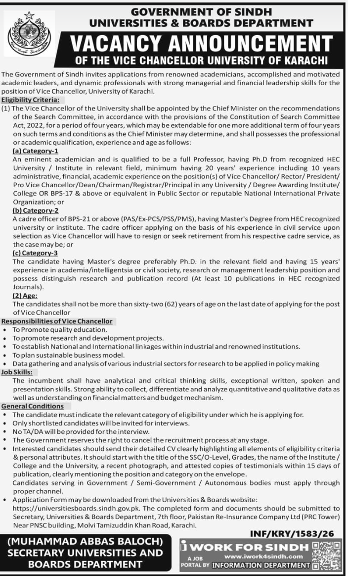 سیکرٹری یونیورسٹی بورڈ اینڈ ایجوکیشن کی جانب سے نئے وائس چانسلر کی تعیناتی کے لیے باضابطہ اشتہار جاری کر دیا گیا ہے، جس میں پروفیسرز اور انتظامی عہدوں پر فائز افسران کے لیے علیحدہ علیحدہ اہلیت مقرر کی گئی ہے۔ امیدواروں کے لیے عمر کی بالائی حد 62 برس مقرر کیے جانے کے بعد کئی ممکنہ نام خود بخود دوڑ سے باہر ہو گئے ہیں۔